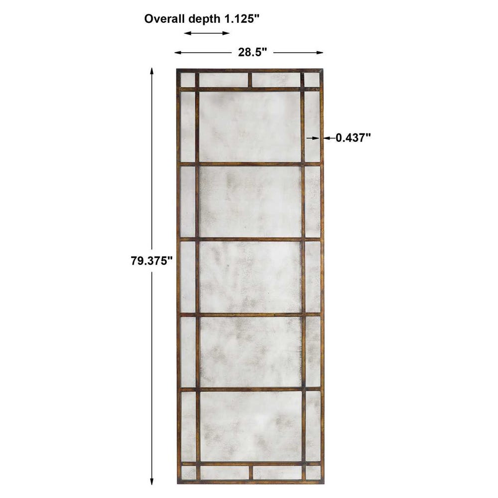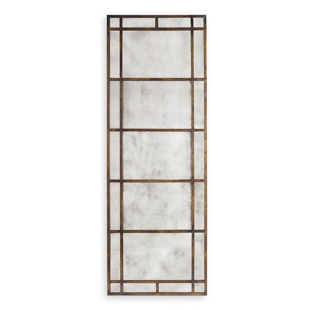 This mirror features a narrow metal frame finished in heavily antiqued rustic bronze with antiqued style mirrors. May be hung horizontal or vertical.