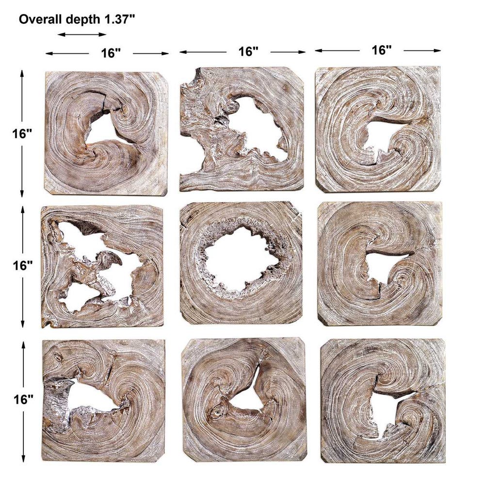 This set of 9 wood wall art features solid natural suar wood finished in a whitewashed ivory with coffee brown undertones. Because each is individually handcrafted, natural variation will occur from piece to piece.
