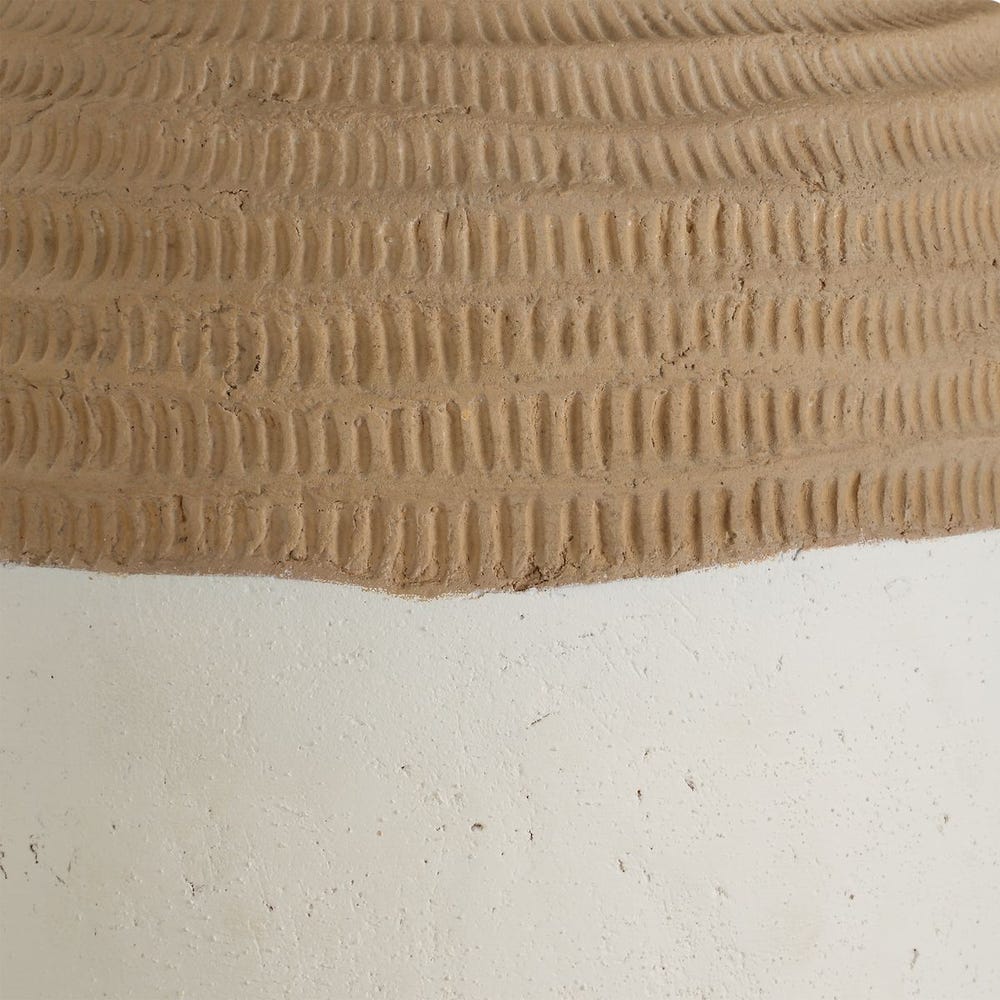 This ceramic table lamp boasts a striking two-tone base showcasing a textured terracotta top with a casual white lower section, all accented with brass plated details. The slightly tapered round hardback drum shade is covered in a crisp white linen fabric.