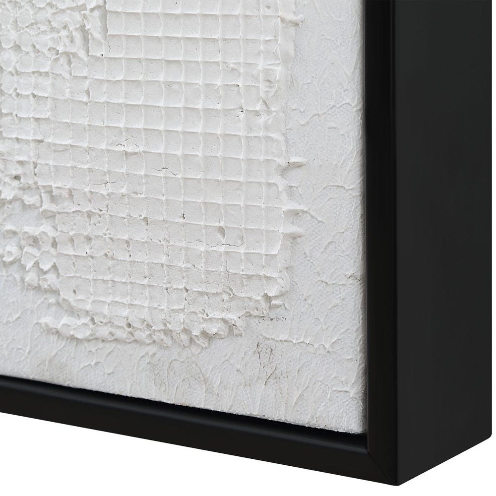Below The Surface hand painted canvas speaks volumes with its all-white palette and intriguing heavy texture. A slim, black gallery frame completes the artwork. Due to the handcrafted nature of this artwork, each piece may have subtle differences.