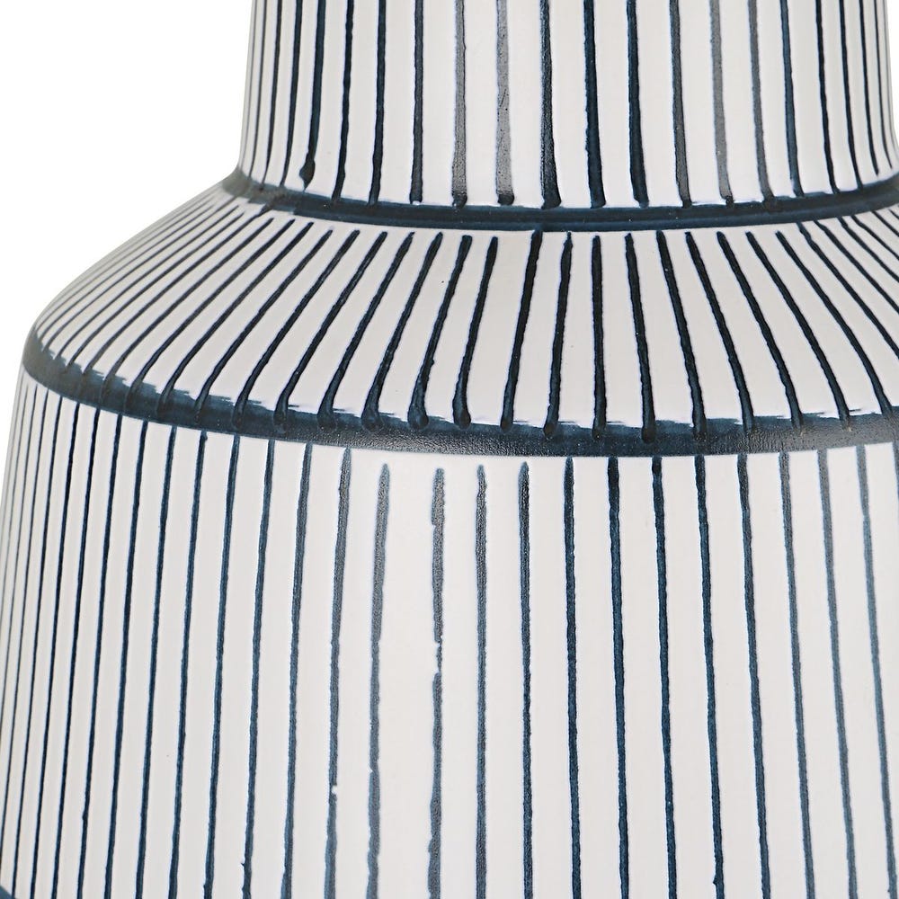 Inspired by the classic nautical stripe knit, this ceramic table lamp sports a satin white glaze with rich navy blue stripes and polished nickel plated accents. The hardback drum shade is covered in a crisp white linen fabric.