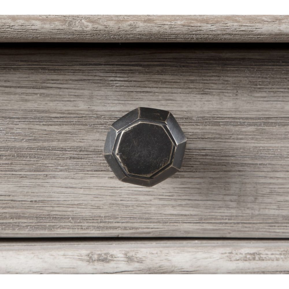 Plantation-grown mango wood makes up the solid, carved and dovetail construction with deep-grained mindi veneer in an aged white finish with antique brass drawer pulls.