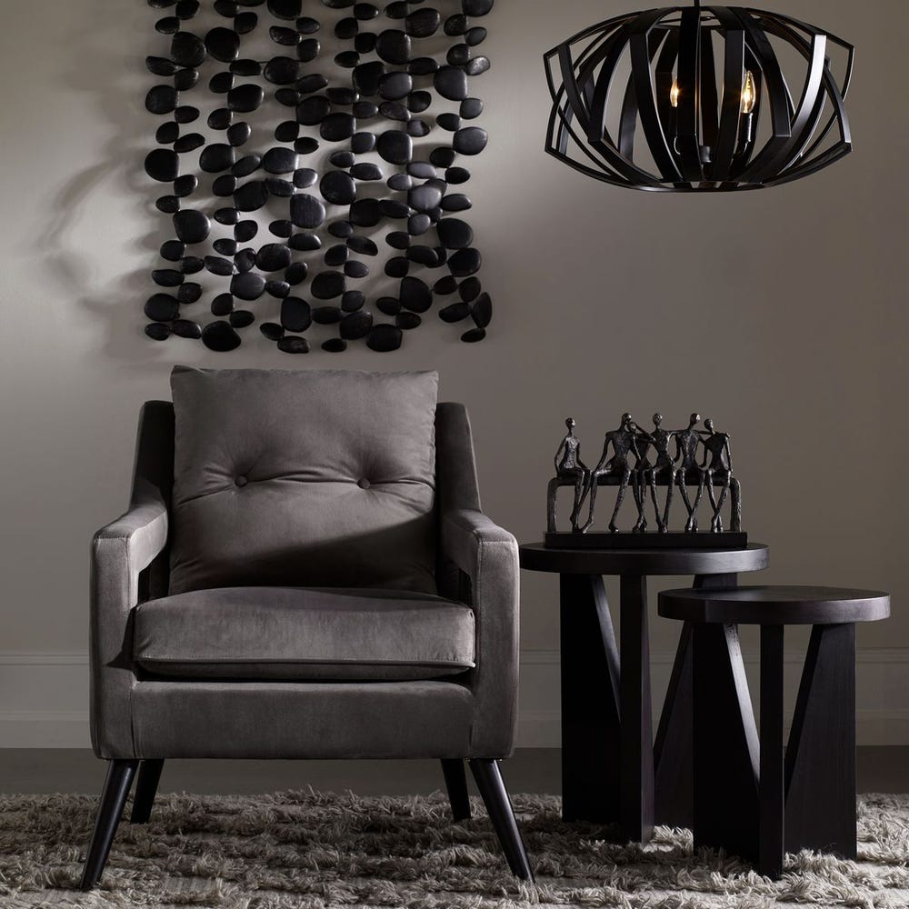 Textured figurines with an appearance of hand molding finished in a heavily aged silver displayed on a porous textured, aged black base.