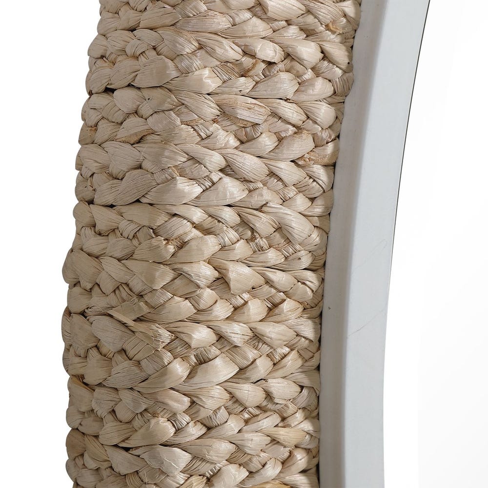 Influenced by modern coastal style, this round mirror has a braided banana leaf and matte white frame exuding a light and airy feel. The piece is accented by a generous 1 1/4" bevel.