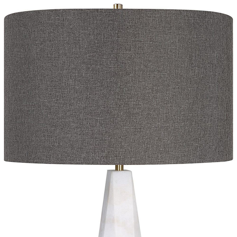 Modern yet classic, this table lamp displays an elegant white honed marble base with natural gray veining and metal accents finished in antique brass. A charcoal gray drum shade complements the piece.