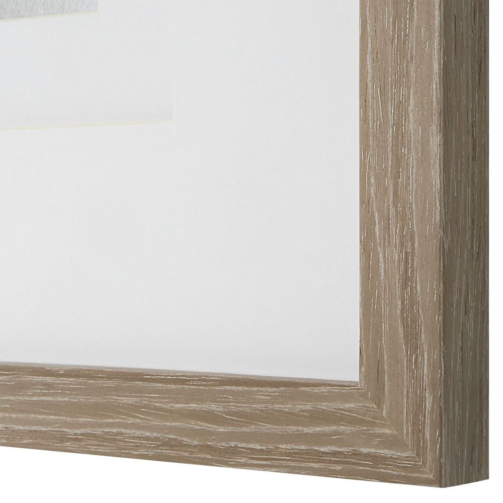 This set of framed prints showcases abstract compositions in cool olive, mauve, rose, and gray tones. Each piece of art is placed under glass and surrounded by double white matting and a solid wood frame in a light oak finish. Artwork by Jennifer Goldberger.