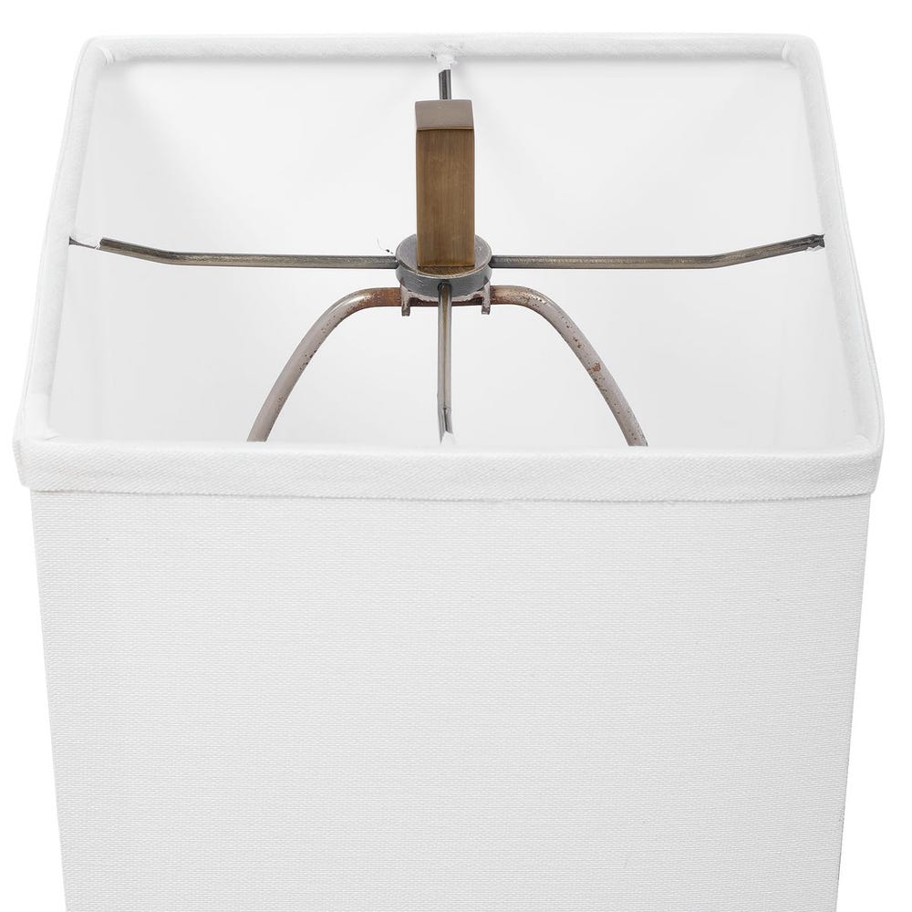 Speckled mercury glass accented with coffee bronze plated details and a crystal foot. The square hardback shade is an off-white linen fabric.