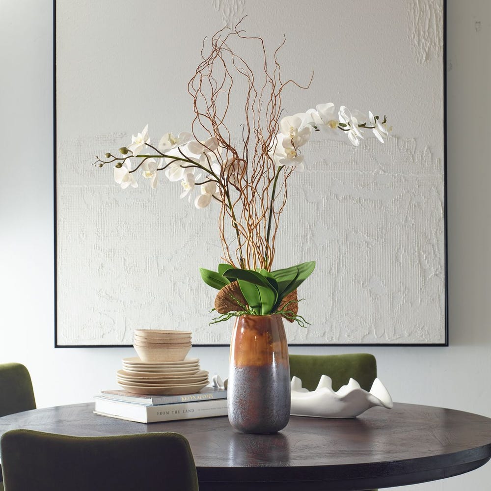 A stunning display of rich earth tones and natural textures. Feautures crisp white orchids paired with natural curly willow and preserved mushroom accents. Set into a handcrafted glass vase in neutral tones of sand, rust and bronze.