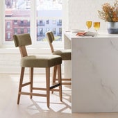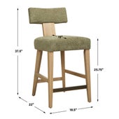 A classic Klismos style with a casual twist featuring a floating back, paired with solid oak in natural with a dark bronze kickplate. Upholstered in a finely textured, cleanable polyester in moss with a toxin-free, eco friendly treatment to help resist water based stains.