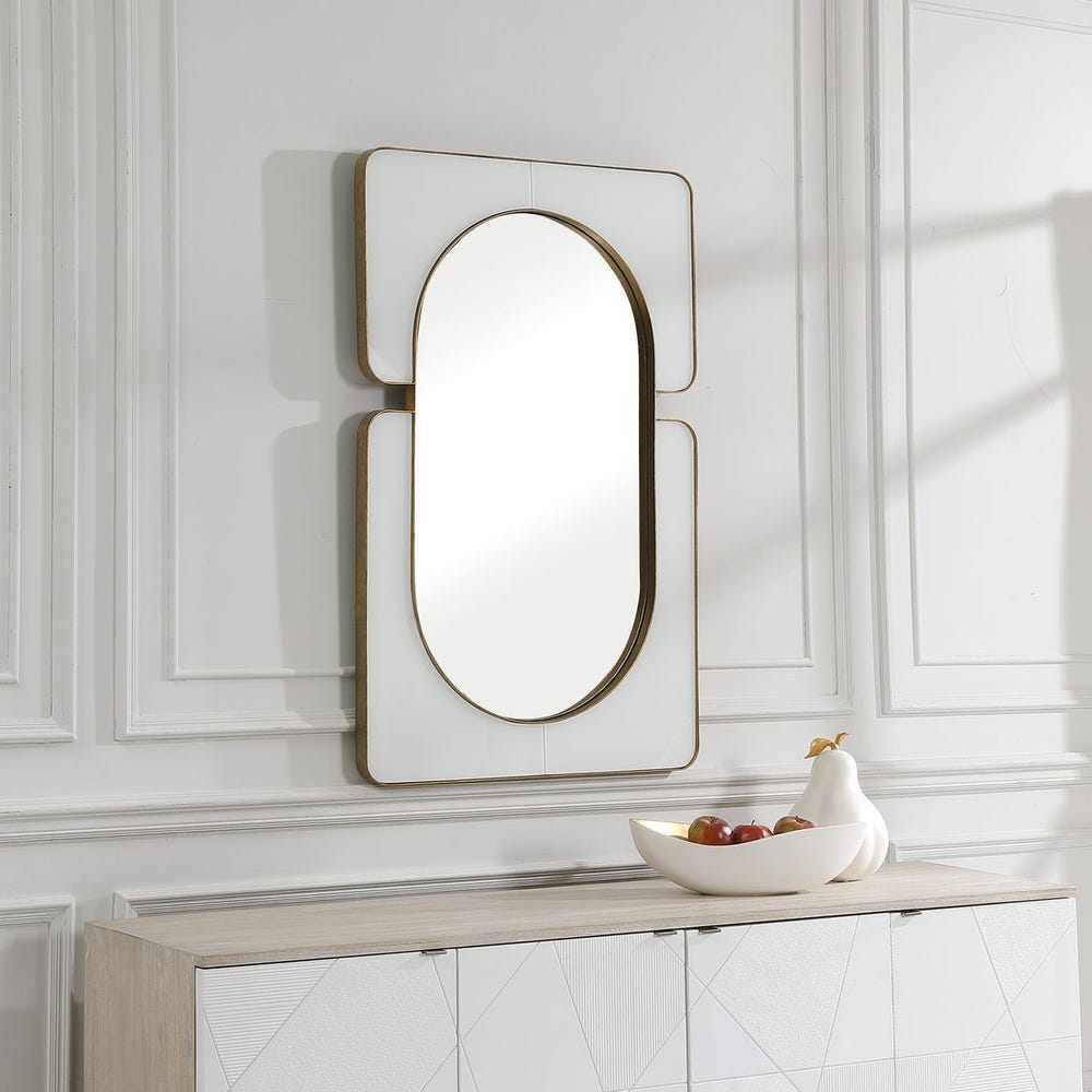 The clean and sophisticated Embrace Mirror has a frame made of white glass encased in an antique gold leaf metal frame. May be hung horizontal or vertical.