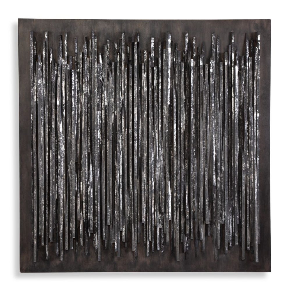 Slate-like strips of teak wood emerge in textured formation. Finished in fossil gray and accented with silver leaf highlights over a heavily aged background with natural wood undertones.