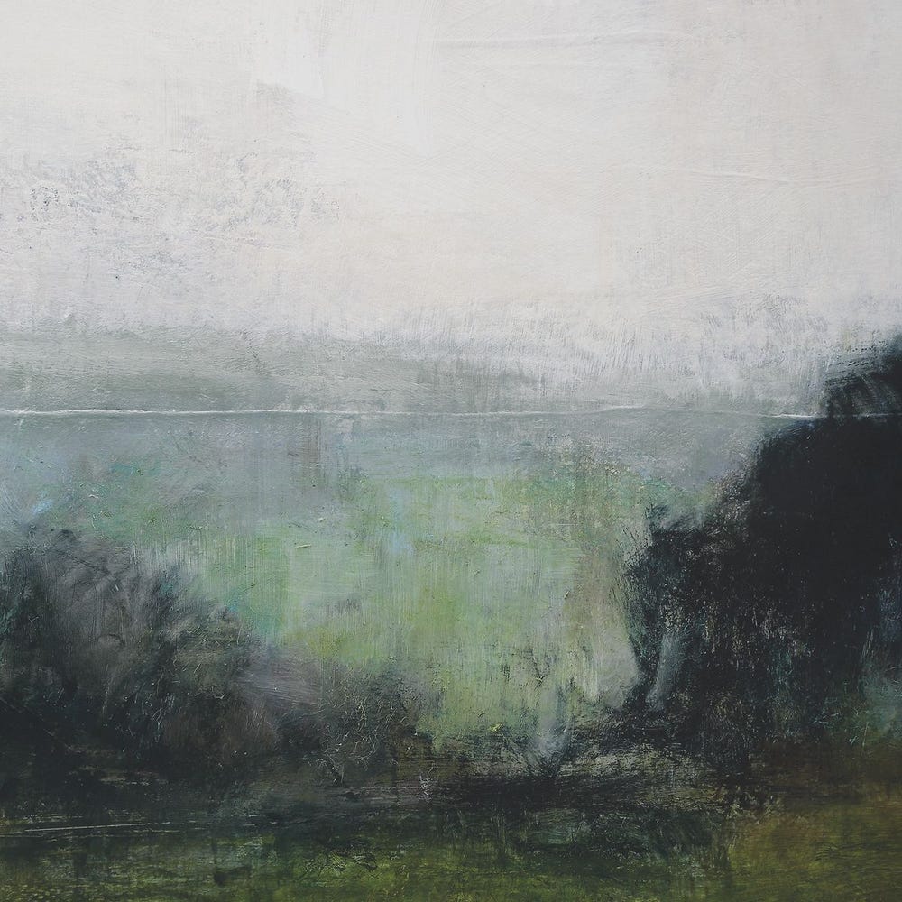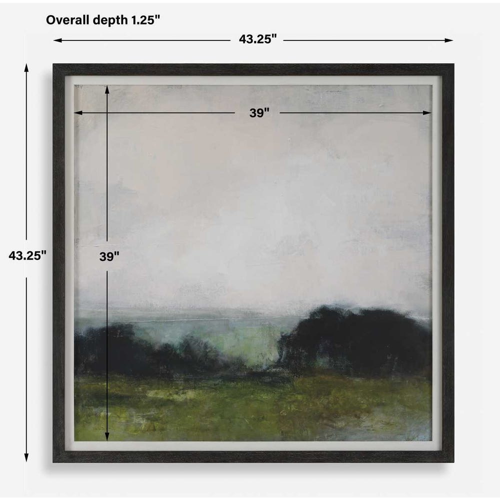 An overcast sky dances across moody shades of olive green earth and shadow black trees. The First View of the Water framed print captures the mysterious beauty of a waterscape. Surrounded by a black wood grain frame complimented with a white linen liner. Artwork by Julia Purinton.