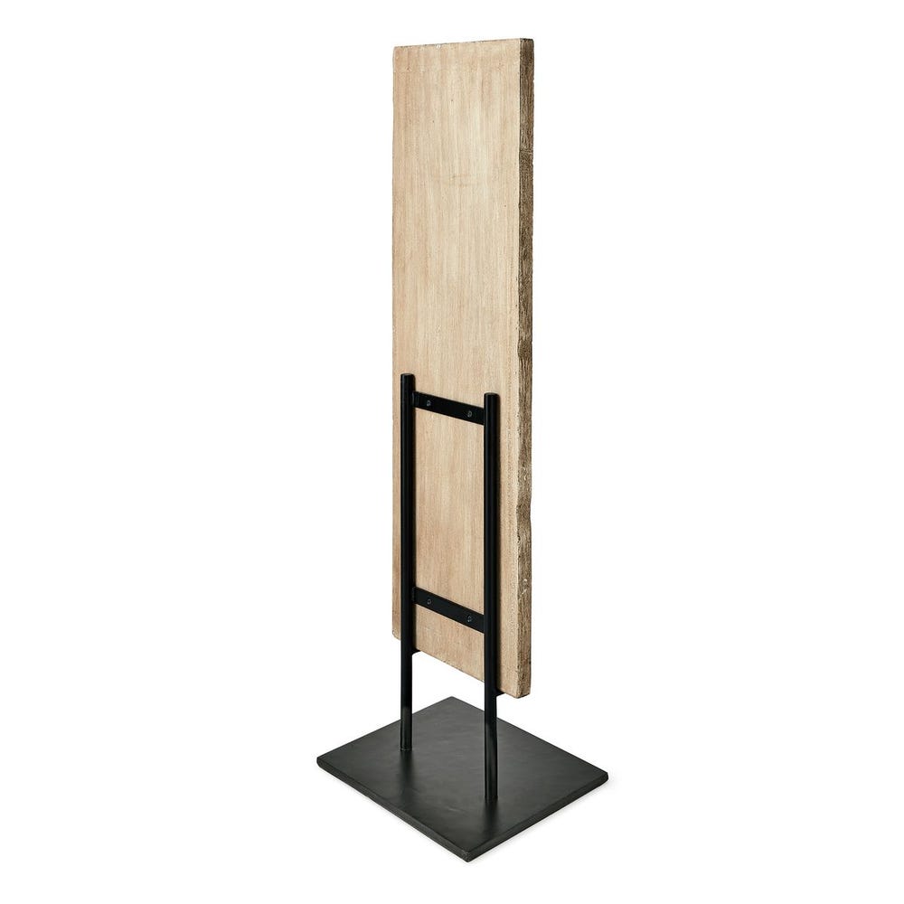 Inspired by ancient ritual sculptures, Intricate details are carved on mango wood with a distressed driftwood finish. Satin black powder finish steel stand is included.