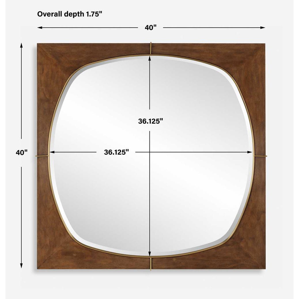 The Garonne Square Mirror features a solid pine wood frame, with an antiqued walnut stain wash. Its profile boasts a subtle slope for added allure, complemented by stainless steel details finished in plated brass. The mirror has a generous 1" shaped bevel.
