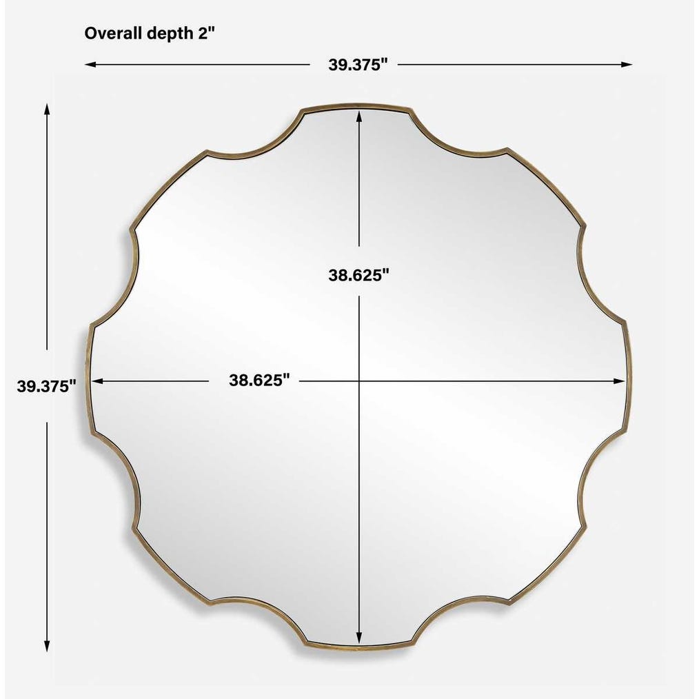 Our gear-shaped mirror boast an iron frame with a channeled side and a richly antiqued golden bronze finish. Its distinctive silhouette encases a floating polished edged mirror, creating a blend of vintage charm with modern allure.