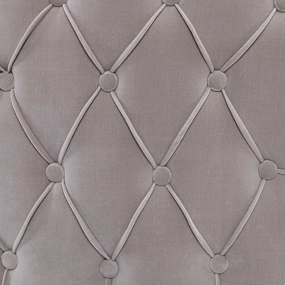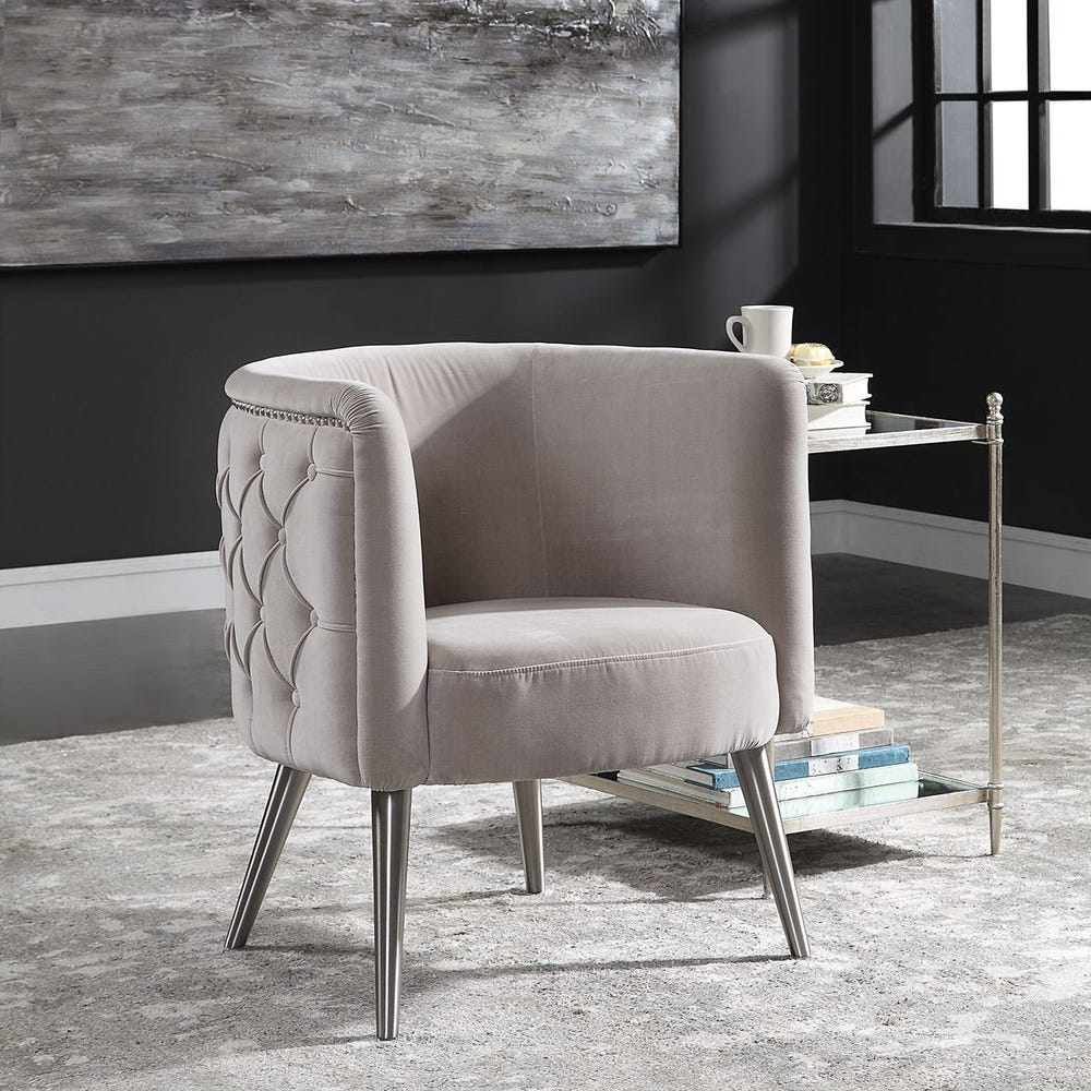 This stylish barrel chair features a plush diamond button tufted surround in a luxurious champagne velvet, lined with antique nickel nail head trim, on metal tapered dowel legs finished in brushed nickel.