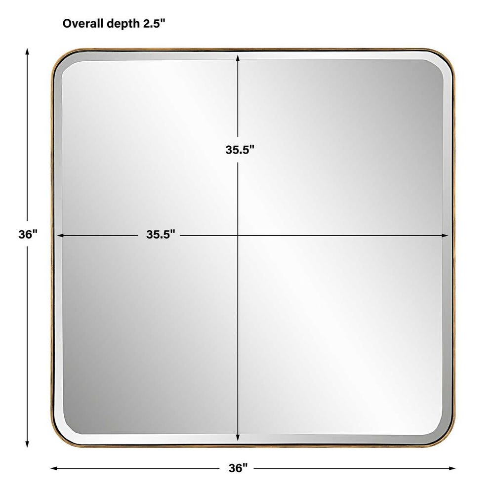 A versatile design that complements virtually any style, this square mirror features a deep iron frame with curved corners, finished in an antique gold. Mirror has a 1" bevel.