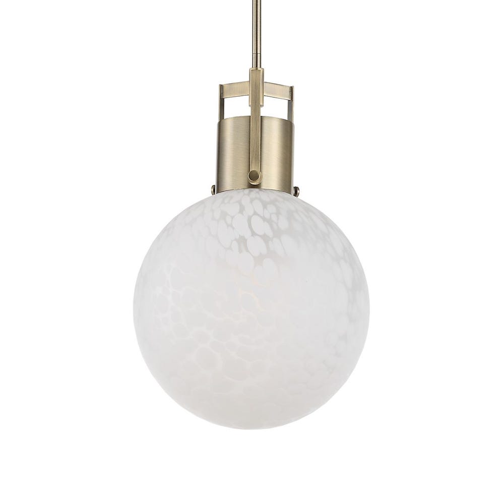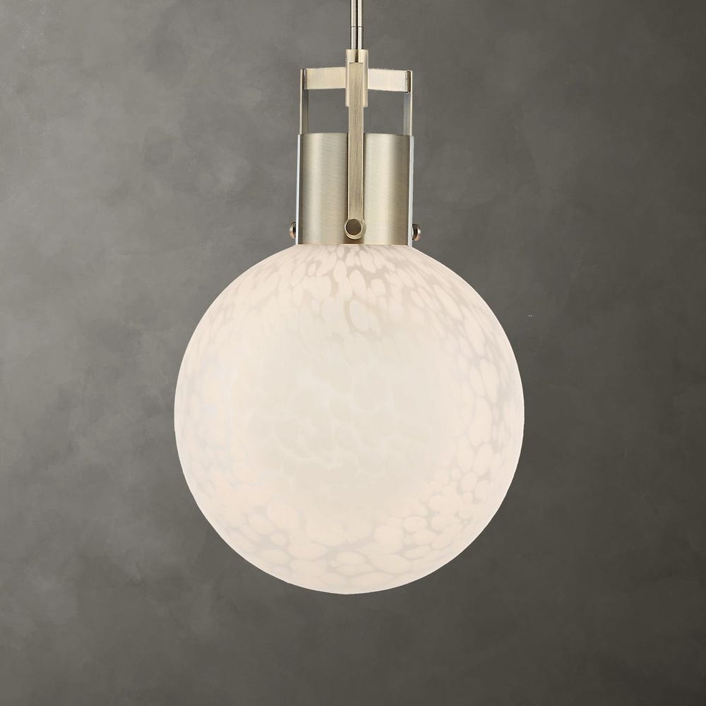 Our Huch pendant features an upper cap with architectural crossbar accents with an oversized etched white spotted glass globe giving warmth and ample light. 1-60 watt max Edison socket. Bulbs not included. Supplied with 15' wire, 3-12" stems and 1-6" stem for adjustable installation.
