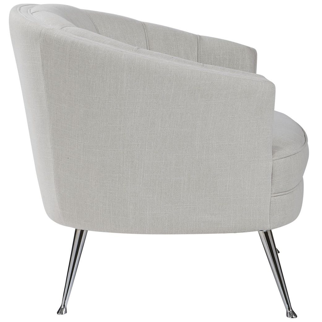 The perfect balance of retro and modern style, this welt trimmed barrel back chair is covered in a casual light tan fabric with channel tufting and polished nickel tapered legs.
