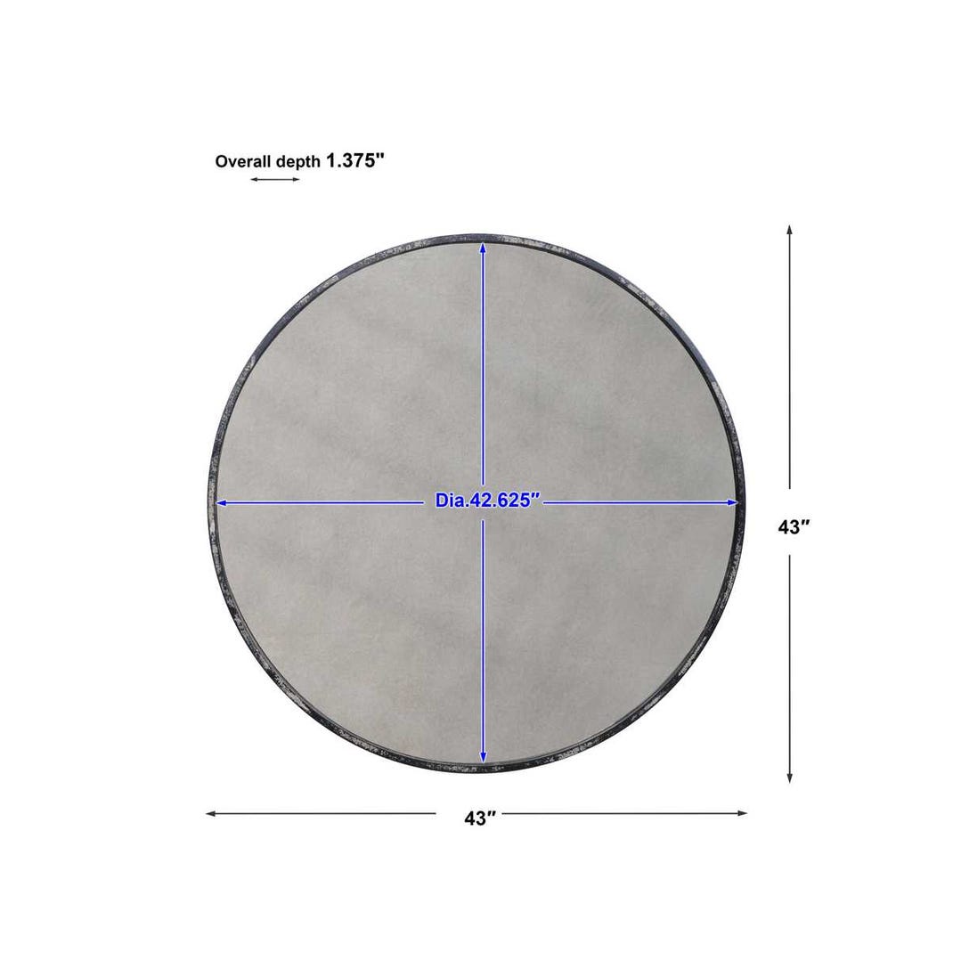 Industrial style round mirror features a petite metal frame finished in rustic black with aged white distressing, surrounding an antique style mirror.