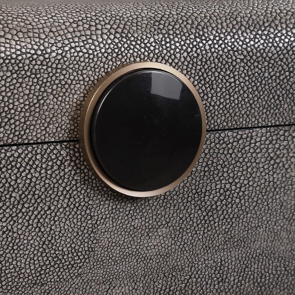 Inspired by the Art Deco era, this decorative box showcases a faux smoke gray shagreen wrapped surface accented by a brushed antique brass and black enamel closure. The interior is finished in matte black.