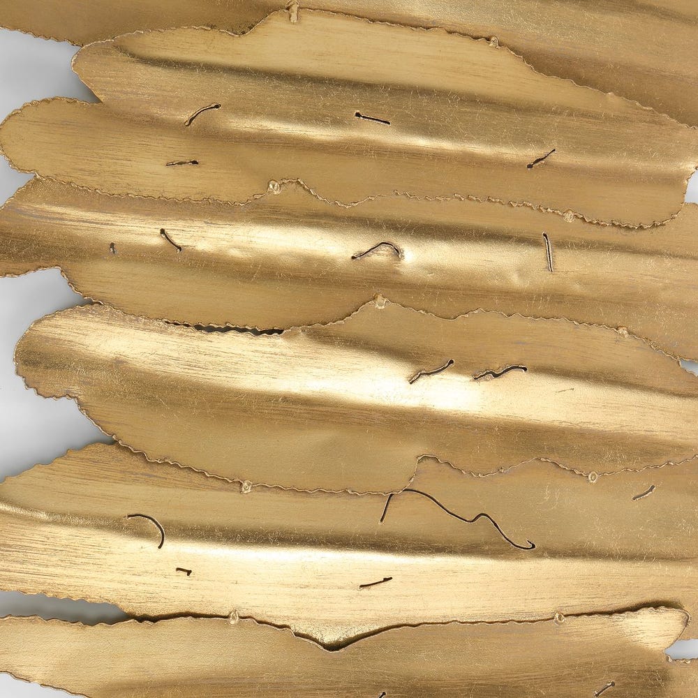 Iron wall art featuring layers of metal strips with crude edging, finished in an antique gold leaf and set on a matte white iron backing. May be hung horizontal or vertical.