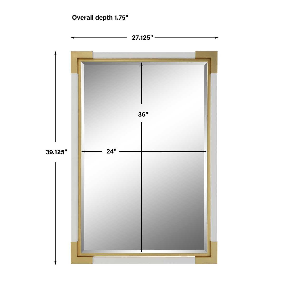 Showcasing an elevated traditional look, this mirror features a white faux shagreen wrapped frame with coordinating gold leaf corner caps and an iron inner liner. Mirror has a generous 1 1/4" bevel. May be hung horizontal or vertical.