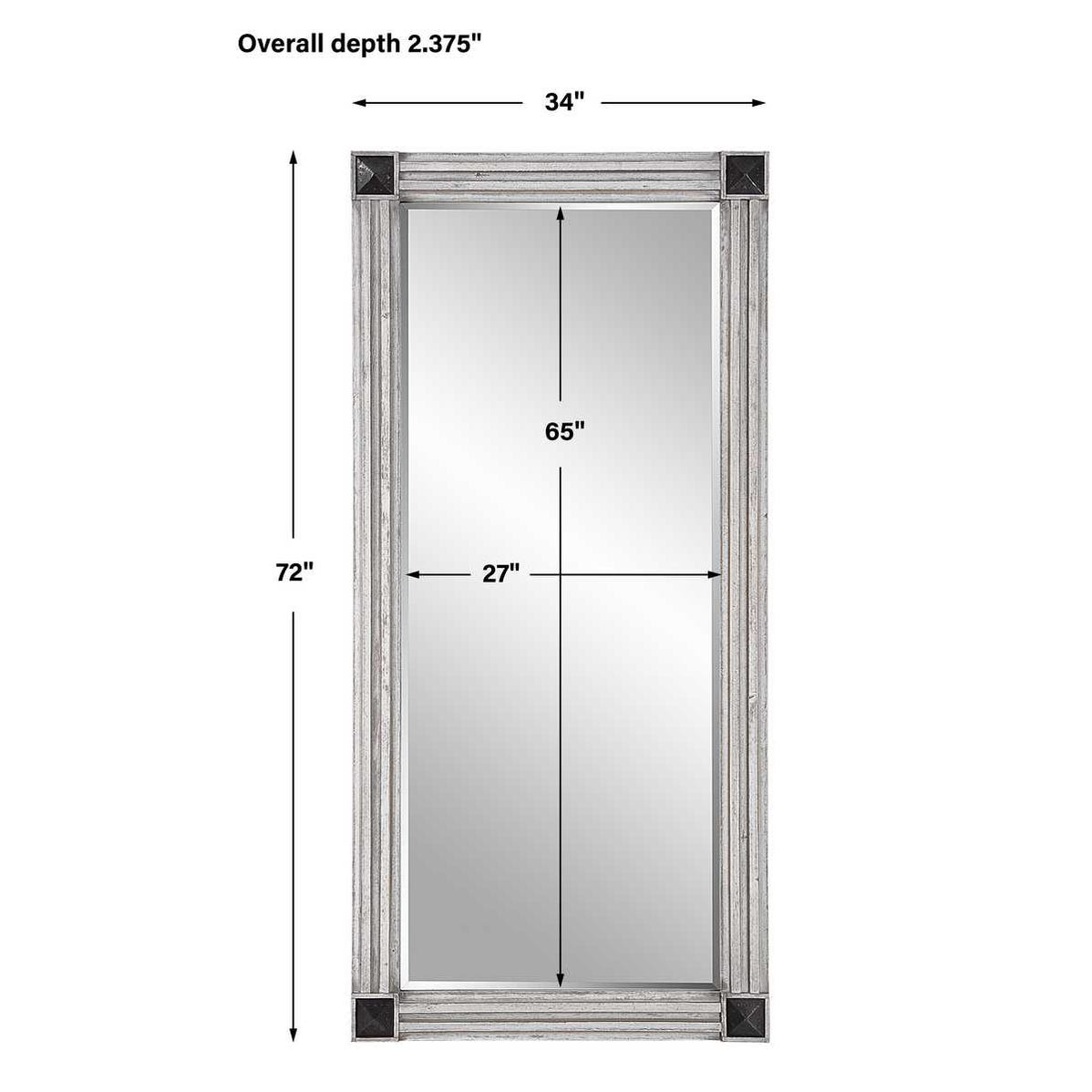 This oversized mirror exudes a stately feel with rustic character. The frame is crafted from solid Fir wood finished in a heavily distressed white wash with gray undertones. Aged dark bronze accents with nail details adorn each corner. Mirror has a 1 1/4" bevel and may be hung horizontal or vertical.