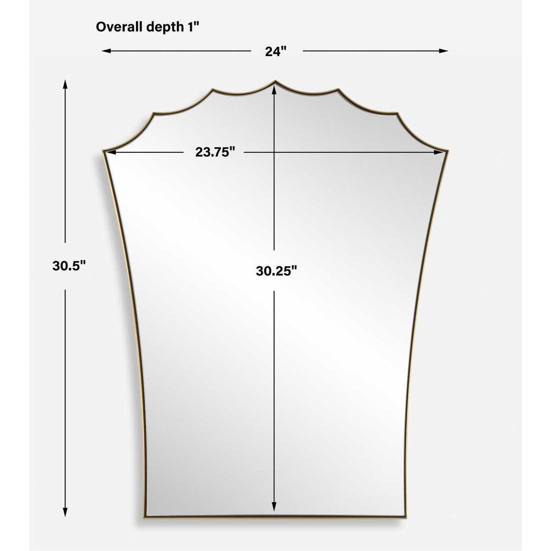 The Monarch Vanity Mirror is crafted with a sleek stainless steel frame finished in plated antique brass. Its scalloped arched top and curved tapered sides add a touch of sophistication, surrounding a floating polished edge mirror that enhances any room's ambiance.
