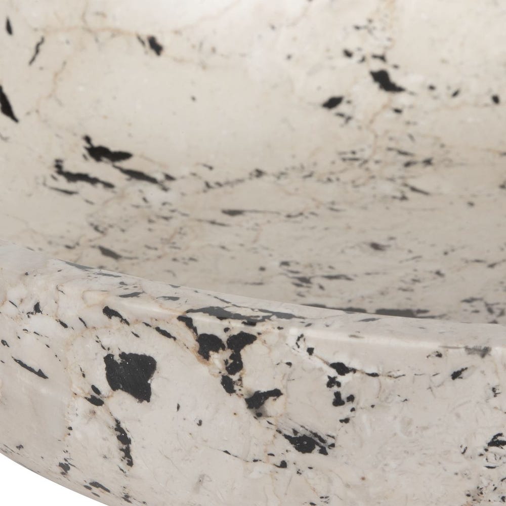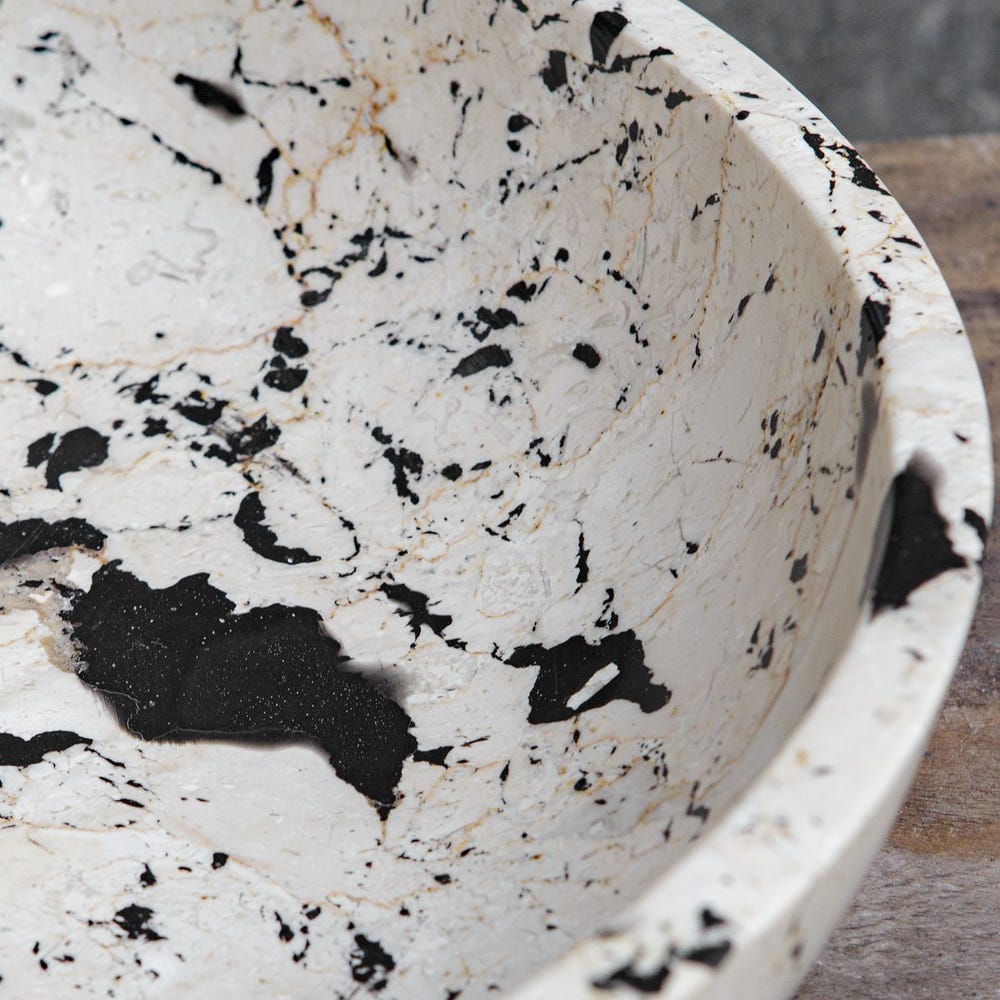 Inspired by the clean lines and bold feel of modern art, this bowl is handcrafted from natural white limestone with black accents. The contrast between the smooth stone and bold detailing highlights the artisan craftsmanship, making it a statement piece for any space. Safe for outdoor use, but protection from freezing temperatures is recommended.