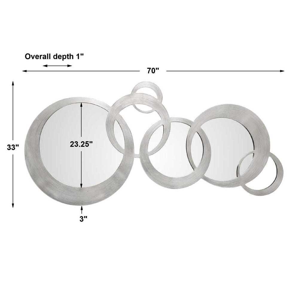 Solid wood frame, featuring a timeless contemporary design of linked, uneven rings, hand finished in a lightly antiqued silver leaf. May be hung horizontal or vertical.