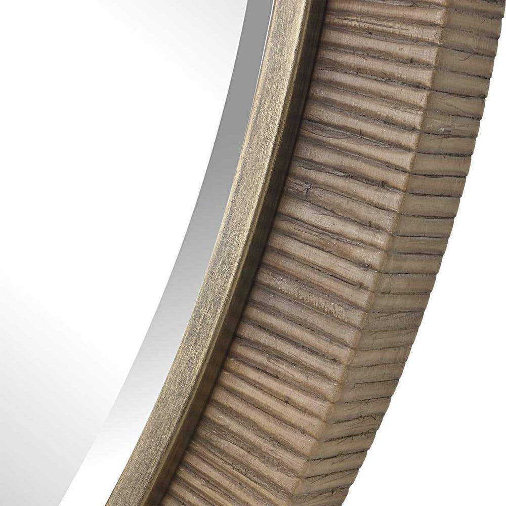 The perfect touch of natural elegance, this round showcases a naturally finished rattan wrapped frame with an iron liner finished in a heavily antiqued gold leaf. Mirror has a generous 1 1/4" bevel.