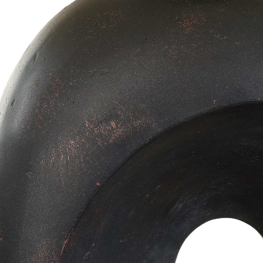 This indoor/outdoor lamp features a unique, concrete sculpted base with a distinctive hollow center in a rich, dark bronze finish. The round hardback shade is covered in a warm white, weather resistant linen fabric.