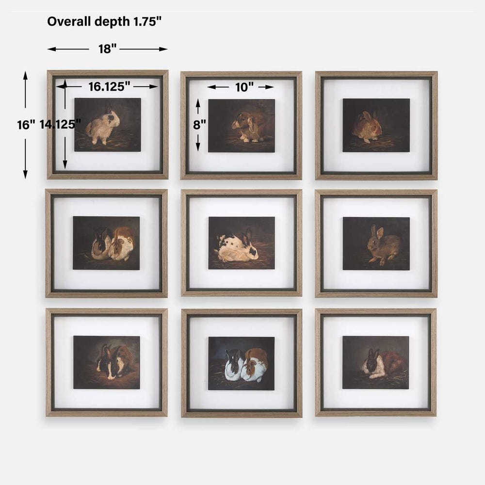 Resting Bunny Framed Prints feature nine individual antiqued rabbit illustrations, each framed in a warm wood grain frame surrounded by a matching black rabbet and causal linen liner. This charming collection adds a touch of rustic elegance and whimsy to any space. Artwork by Marian Parsons.