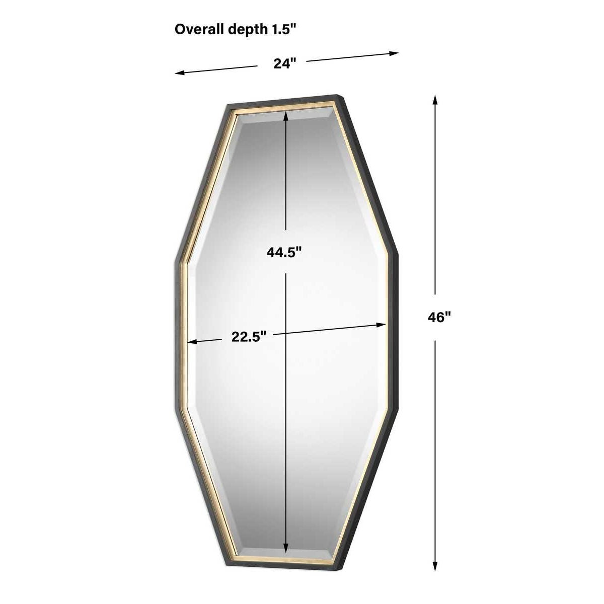 This unique frame is finished in a dark charcoal accented with a metallic gold leaf inner lip. Mirror features a generous 1 1/4" bevel and may be hung horizontal or vertical.