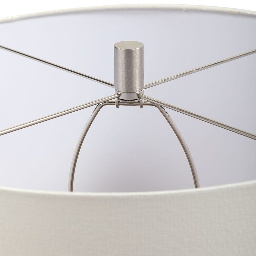 Finished in a stunning deep teal glaze, this ceramic table lamp features hand carved organic vertical lines accented with brushed nickel details. The lamp is paired with a white fabric drum shade.