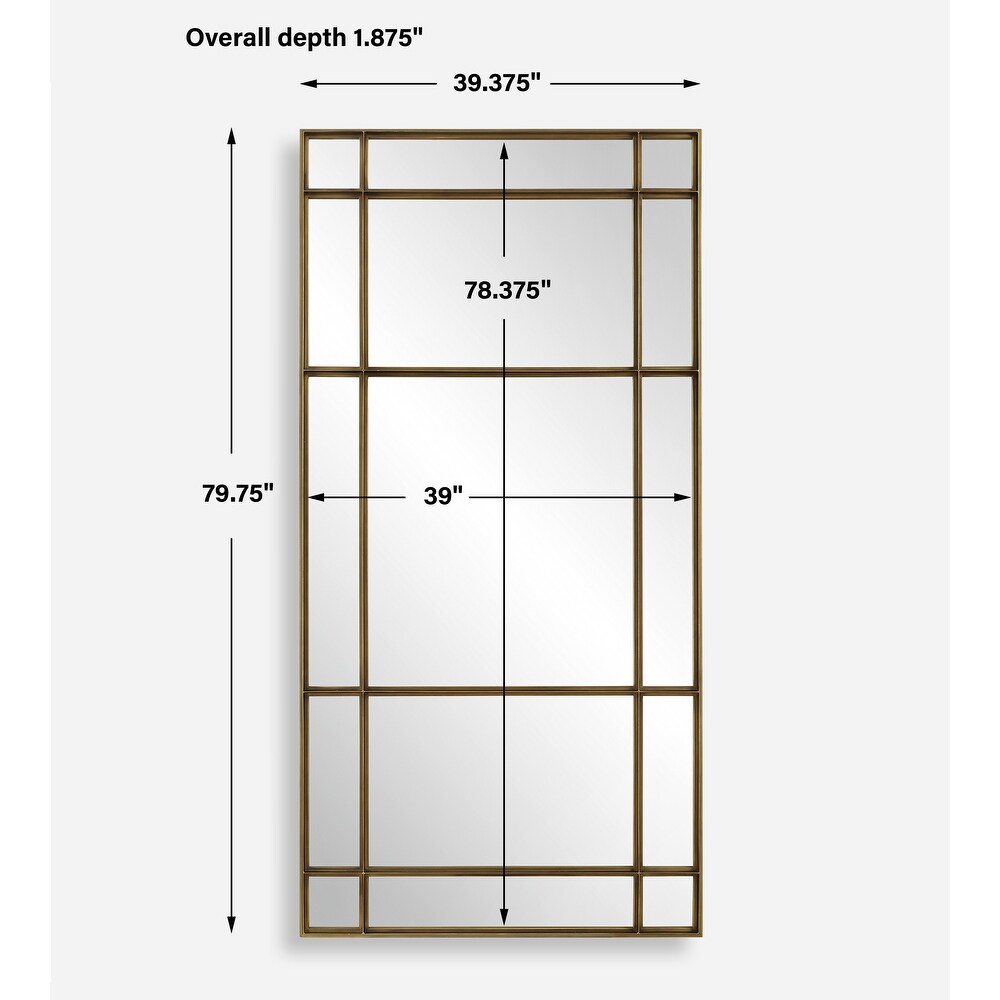 This oversized mirror features a heavy iron frame with deep channels reminiscent of vintage warehouse windows. Finished in a heavily antiqued gold, it adds a touch of industrial charm and timeless elegance to any room.