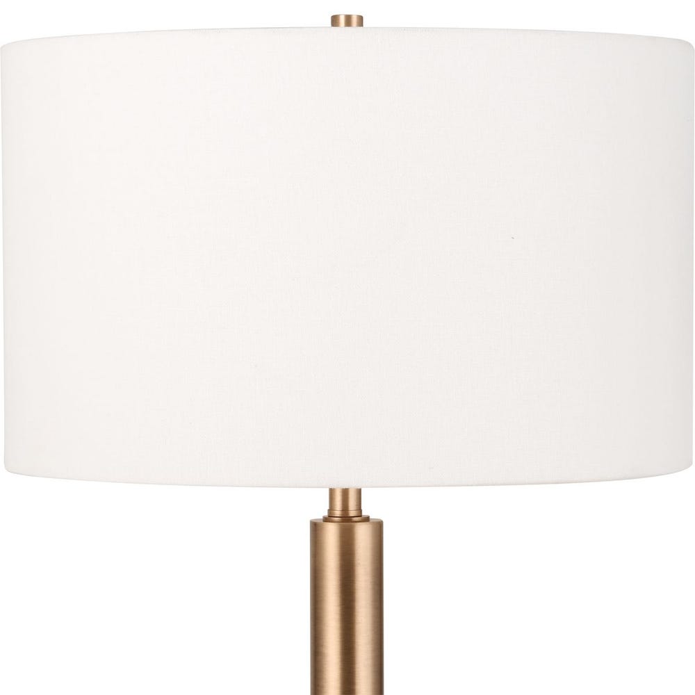 The Stowe Floor Lamp features a tapered metal stem finished in a sleek satin black, accented with brass plated details. The round hardback drum shade is covered in a crisp white linen fabric.