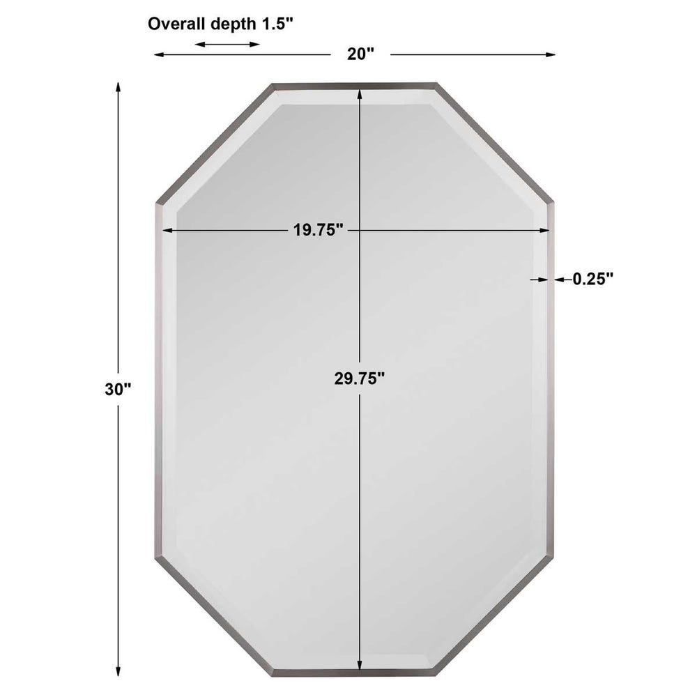 This traditional style vanity mirror takes on a more updated sleek look featuring a simple octagon shape with a petite stainless steel frame finished in brushed nickel and a 1" bevel. May be hung horizontal or vertical.