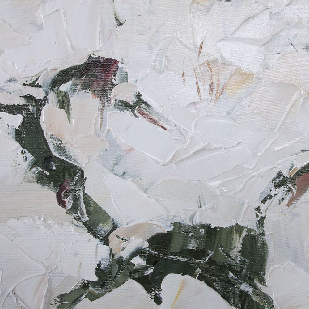 Hand painted on canvas, this floral artwork depicts a collection of the popular sweet southern flower. White and cream tones pop against a forest green background, all complemented by an antique silver leaf gallery frame. Due to the handcrafted nature of this artwork, each piece may have subtle differences.