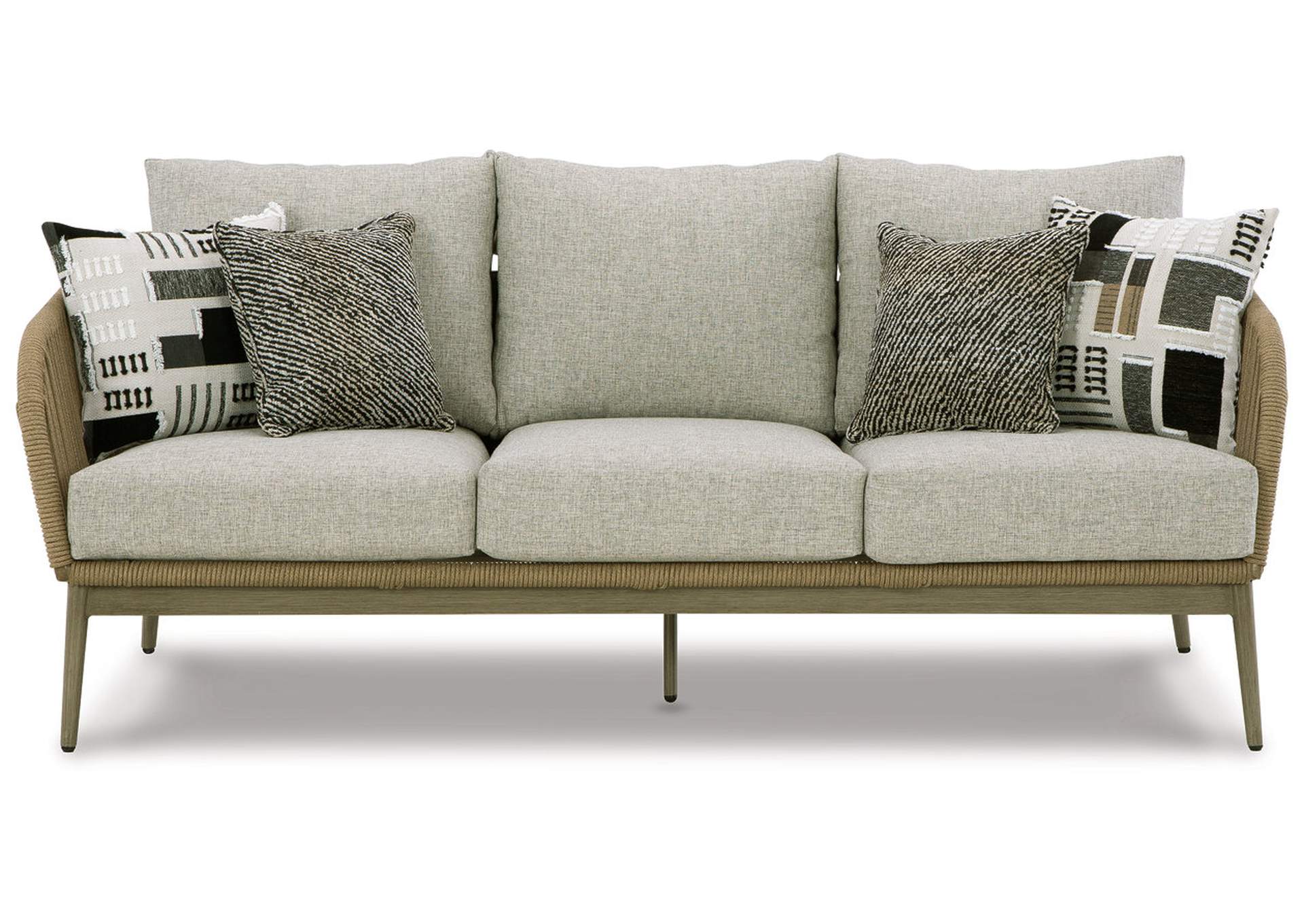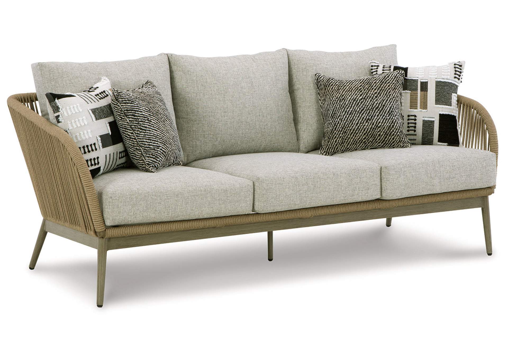 Effortless in its beauty, this outdoor sofa echoes your easygoing sensibilities. Simply stunning in a brown wood-look finish and paired with handwoven rope on a sturdy aluminum frame, it’s an ideal companion for relaxing poolside or hosting friends alfresco. And with high-performance beige Nuvella+™ fabric, this sofa makes stylish living a breeze.