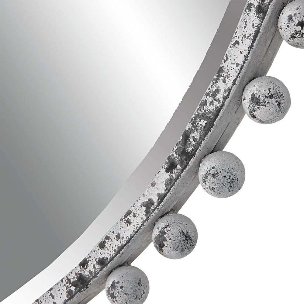 Petite iron spheres line the outer edge of this round frame, finished in a heavily distressed aged white with rustic black undertones. Mirror features a generous 1 1/4" bevel.