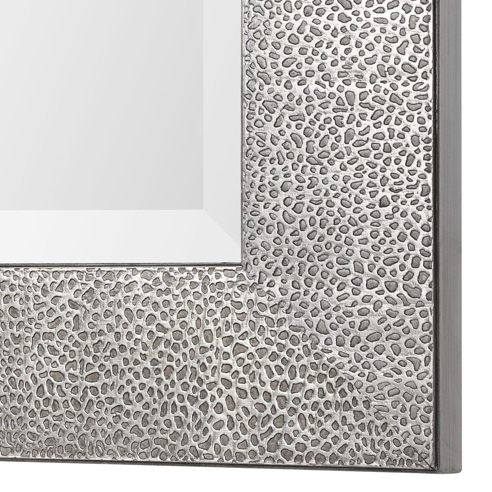 This contemporary design features a textured solid wood frame finished in a metallic silver with a light gray wash. Mirror features a generous 1 1/4" bevel and may be hung horizontal or vertical.