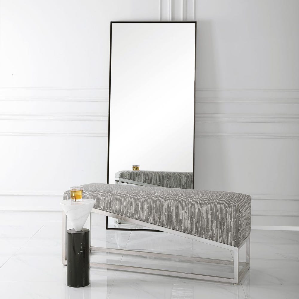 Showcasing sleek angular lines, this bench is the perfect modern accent. The forged iron base is finished in brushed silver leaf and is accented by a medium gray and white geometric fabric.