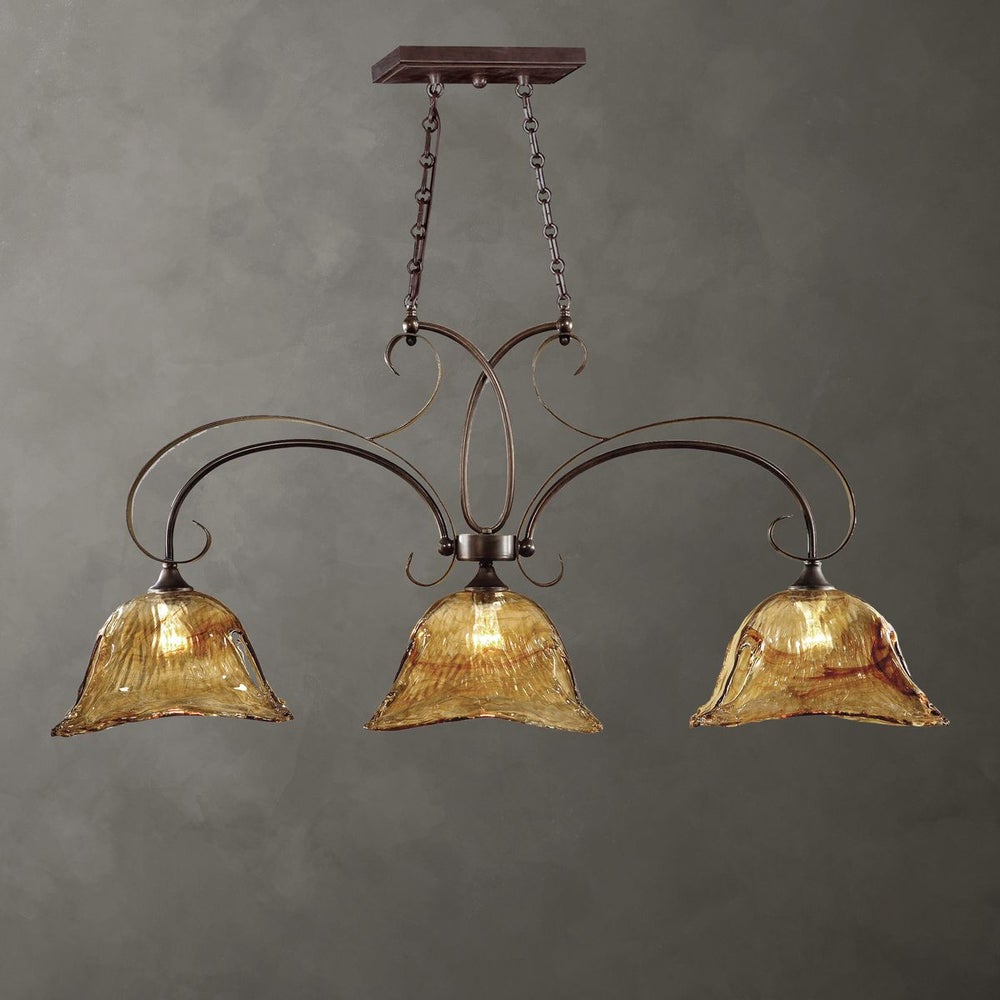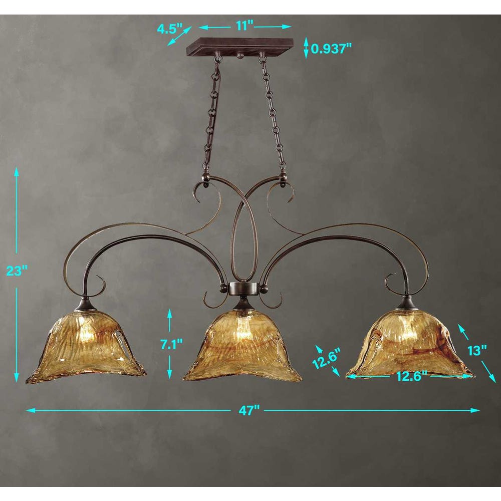 Heavy handmade glass is held in classic European iron works giving these pieces a contemporary quality, with strong traditional appeal as well. 3-100 watt max, Edison sockets. Bulbs not included. Supplied with 20' wire and 7' chain for adjustable installation.