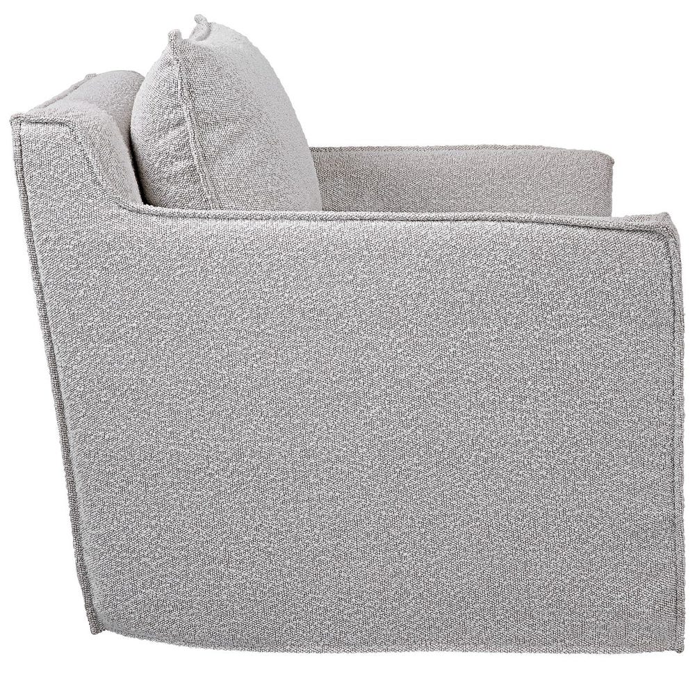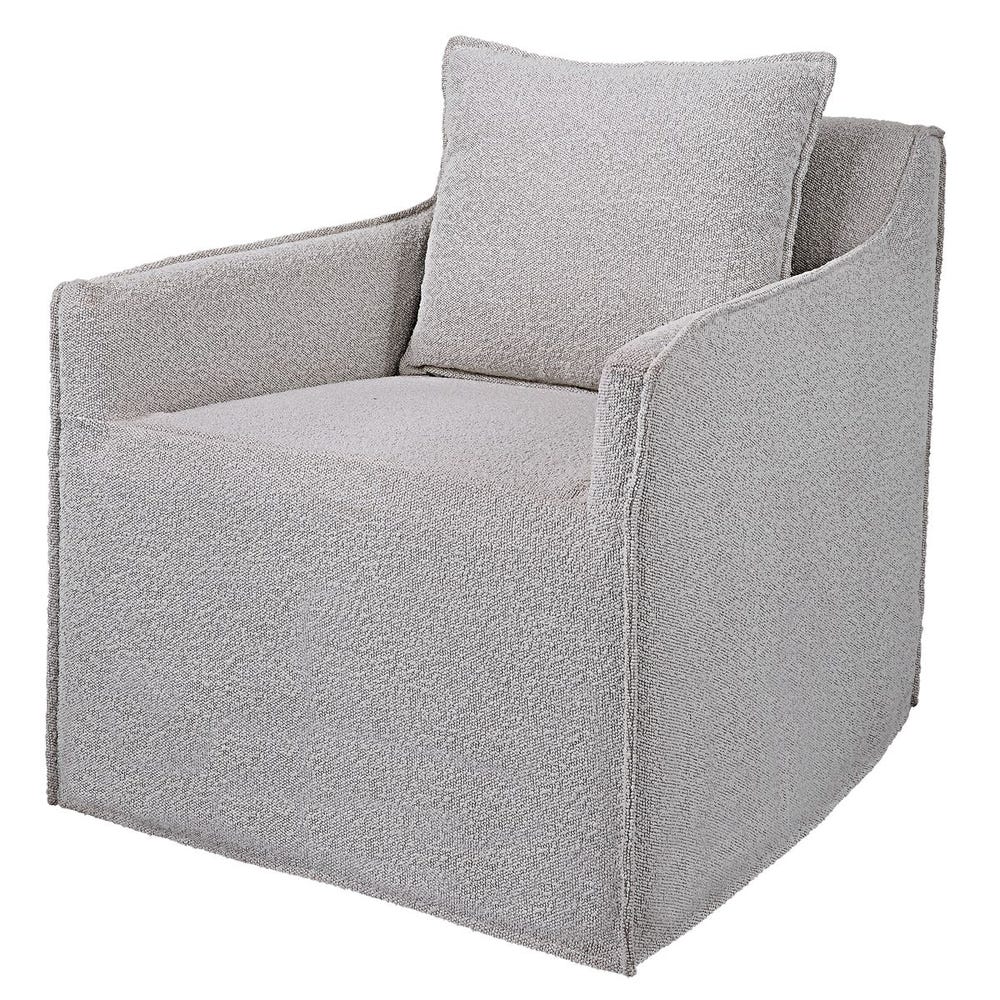 Casual swivel accent chair features a tailored slipcover made from ivory andlight gray boucle fabric with flanged edges and a matching square pillow. The hardwood swivel base is finished in a natural ceruse.