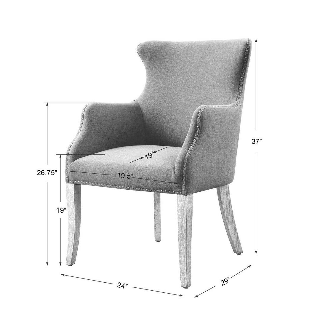 Contemporary style can be found in this solidly constructed wing chair. Featuring a denim blue linen blend fabric accented with antique bronze nail head trim, on slightly tapered oak legs in a weathered sandstone finish with a light tan glaze.